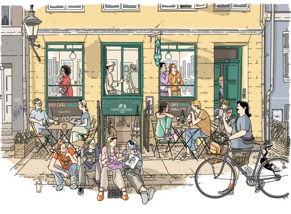 Vi udstiller og sælger dansk og international tegneseriekunst. I caféen kan du blandt andet nyde økologisk vin, øl, kaffe, drinks, snacks og toasts.